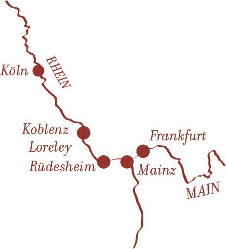 Diese Route erwartet Sie: ab Köln über Rüdesheim, Mainz, Frankfurt am Main, Passage Loreley & UNESCO Welterbe Mittelrheintal und Koblenz zurück nach Köln