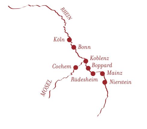 Diese Route erwartet Sie: ab Köln - Cochem - Koblenz - Nierstein - Mainz - Oestrich Winkel - Rüdesheim - Passage Loreley & UNESCO-Welterbe Mittelrheintal - Boppard - Bonn - Köln