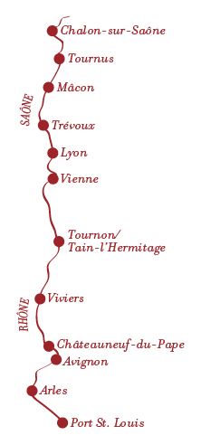 Diese Route erwartet Sie: ab Lyon mit Panoramafahrt durch Lyons Altstadt, Tournus*, Chalon-sur-Saône, Tournus, Mâcon mit Liegezeit über Nacht bis zum nächsten Abend, Trévoux, Viviers, Port St. Louis, Arles mit Liegezeit über Nacht bis zum übernächsten Abend, Avignon mit Liegezeit bis zum nächsten Tag mittags, Châteauneuf-du-Pape, Tournon/Tain-l´Hermitage, Vienne, Lyon mit Liegezeit über Nacht